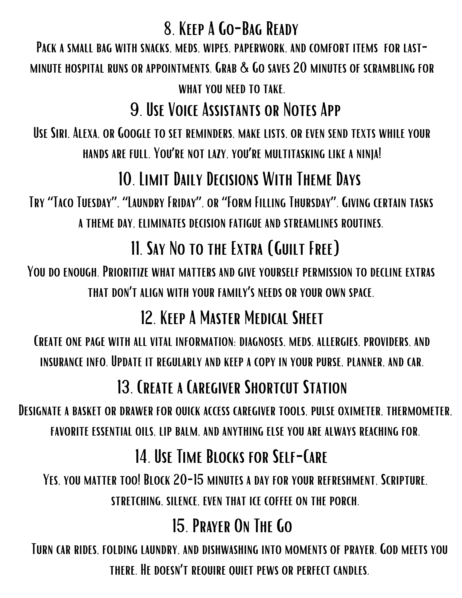 When you are a medical mom or caregiver, time is in short supply! There always seems to be one more thing on the list - it never ends. Here are some tips to help you make the most out of the time you have. Download your free printable "15 Time Saving Tips For Caregivers".